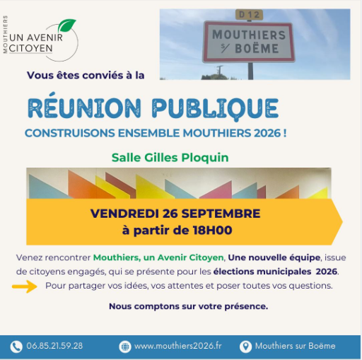 Prochaine étape : le 26 septembre, avec une réunion publique à Mouthiers. Ce sera un temps fort. Nous y présenterons les premiers enseignements du questionnaire, nos grandes orientations, mais surtout, nous continuerons à dialoguer avec vous. Ce moment se veut ouvert, convivial et constructif. Vous pourrez également nous remettre vos questionnaires papier si vous ne l’avez pas encore fait.